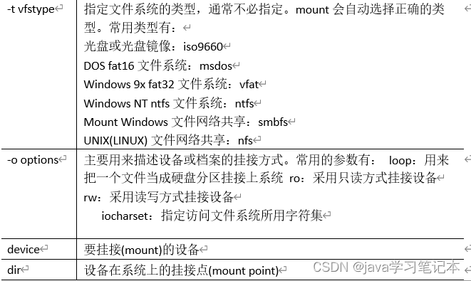 2) 基本语法 mount [-t vfstype] [-o options] device dir (功能描述:挂载设备) umount 设备文件名或挂载点 (功能描述:卸载设备) 3) 参数说明