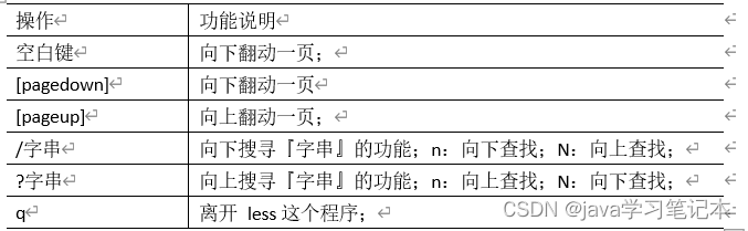 分屏显示文件内容 less 指令用来分屏查看文件内容,它的功能与 more 指令类似,但是比 more 指令更加强大,支持各种显示终端。less 指令在显示文件内容时,并不是一次将整个文件加载之后 才显示,而是根据显示需要加载内容,对于显示大型文件具有较高的效率。 1) 基本语法 less 要查看的文件 2) 操作说明