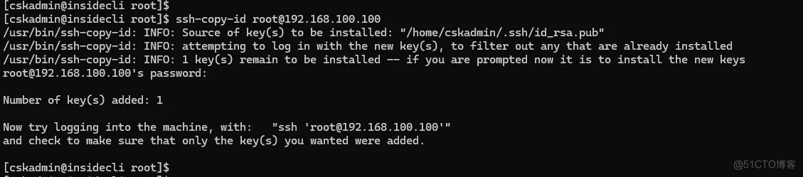 [cskadmin@insidecli root]$ ssh-copy-id root@192.168.100.100