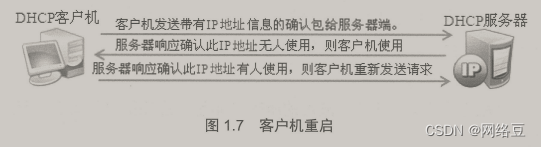 户机还没有接收到服务器的DHCP ACK消息。当客户机收到DHCP ACK消息时。它就配置了IP地址。完成TCP/P的初始化.如图1.6所示。