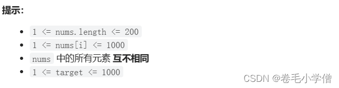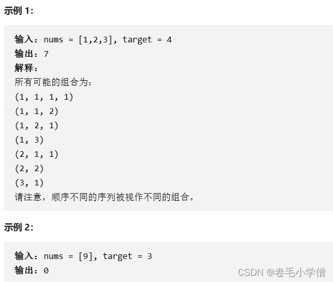 377. 组合总和 Ⅳ 给你一个由 不同 整数组成的数组 nums ,和一个目标整数 target 。请你从 nums 中找出并返回总和为 target 的元素组合的个数。 题目数据保证答案符合 32 位整数范围。