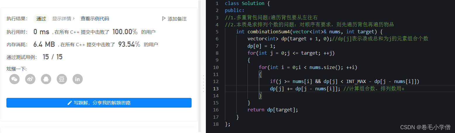 vector<int> dp(target + 1, 0);//dp[j]表示凑成总和为j的元素组合个数