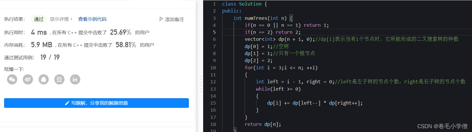 vector<int> dp(n + 1, 0);//dp[i]表示当有i个节点时,它所能形成的二叉搜索树的种数