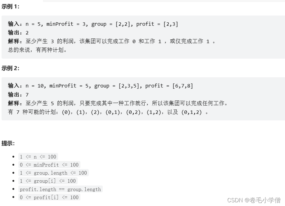 879. 盈利计划 集团里有 n 名员工,他们可以完成各种各样的工作创造利润。 第 i 种工作会产生 profit[i] 的利润,它要求 group[i] 名成员共同参与。如果成员参与了其中一项工作,就不能参与另一项工作。 工作的任何至少产生 minProfit 利润的子集称为 盈利计划 。并且工作的成员总数最多为 n 。 有多少种计划可以选择?因为答案很大,所以返回结果模 10^9 + 7 的值。