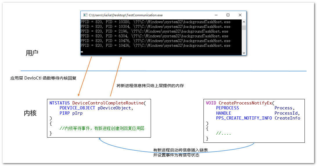 前段时间一直在学习内核监控进程创建的知识,虽然成功监视,但一直在内核输出到 DebugView 中,不能通知我们的应用程序来显示指定内容,无论如何也不方便,所以赶在周末参考了 Windows 内核安全与驱动开发 中第五章 “应用与内核通讯” 制作了以下程序。程序主要使用了内核事件 KEVENT 实现同步,更多请参考 Windows 内核安全与驱动开发,程序运行后的效果如下: