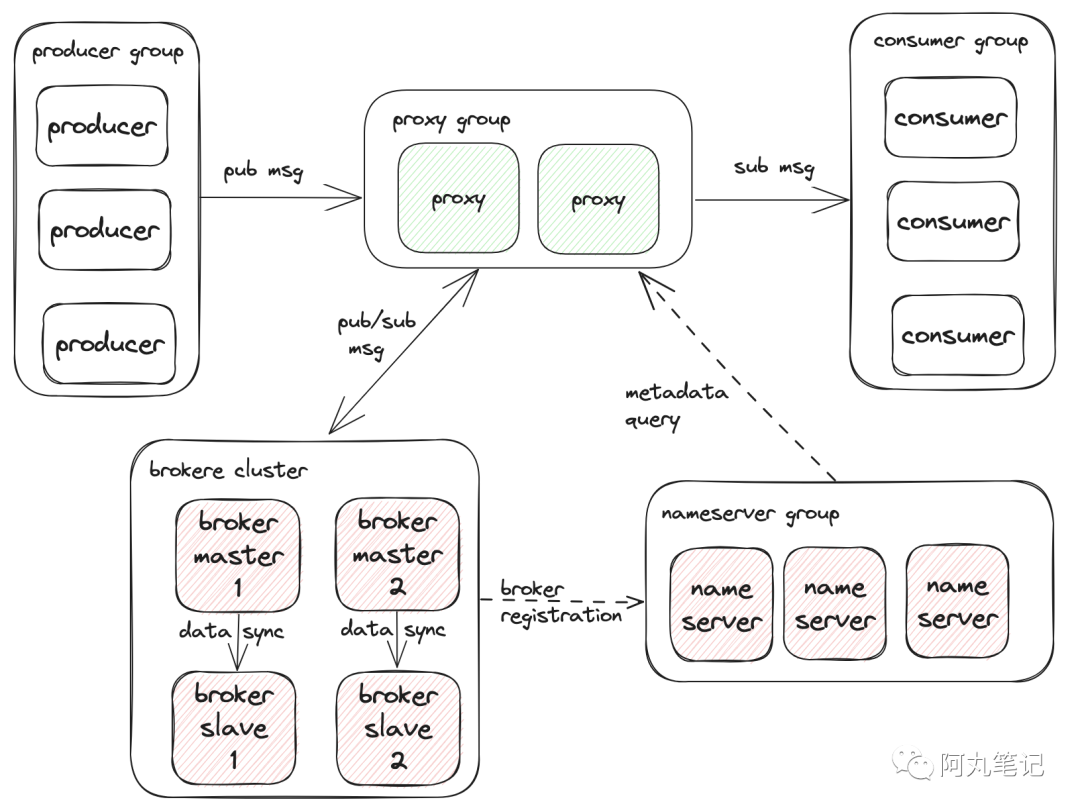 - 另外还有主题(Topic)、队列(MessageQueue)、消息(Message)、消费者组(ConsumerGroup)、订阅关系(Subscription)等核心概念