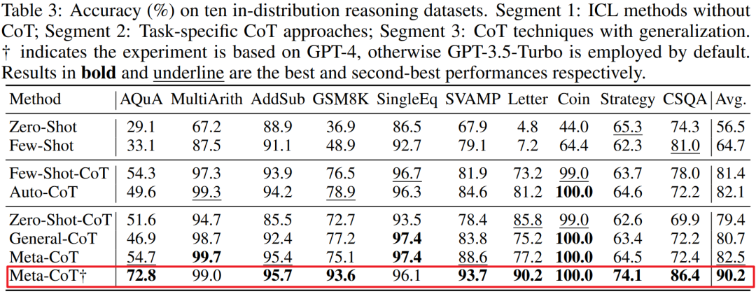 作者对十个分布推理任务进行了实验,其中包括算术推理、常识推理和符号推理。Meta-CoT在推理与泛化能力方面具有出色的表现。值得注意的是,Meta-CoT在SVAMP具有最先进的结果:93.7%