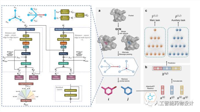近年来,人工智能技术已逐渐成为药物研发领域中重要的技术手段之一。基于已知的结构和活性数据,如何引入合理的关系归纳偏置使得AI模型可以更有效地提取其中蕴含的物理化学知识和分子相互作用规律,是开发先导化合物优化方法的关键。在PBCNet中,模型采用了一种孪生网络架构(图1),可以较好地消除不同来源或实验测定条件下结合亲和力数据中存在的系统误差;考虑到分子间非键相互作用往往服从严格的几何先验,模型将原子之间的距离和化学键之间的角度信息编码作为注意力偏置项,有助于分子间相互作用信息的交互;此外,相对于二维拓扑图,模型同时引入距离和角度信息得到三维分子图,可以更全面地描述了蛋白-配体之间的分子结合信息。