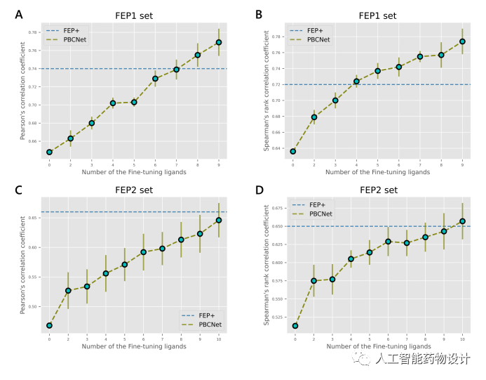 图2 小样本学习中PBCNet的性能随微调样本量(已知活性化合物数量)的变化趋势。x轴表示微调样本的数量,y轴表示PBCNet的预测性能,蓝色虚线为文献报道的Schrödinger FEP+的预测性能。误差线表示10次独立运行的标准偏差。
