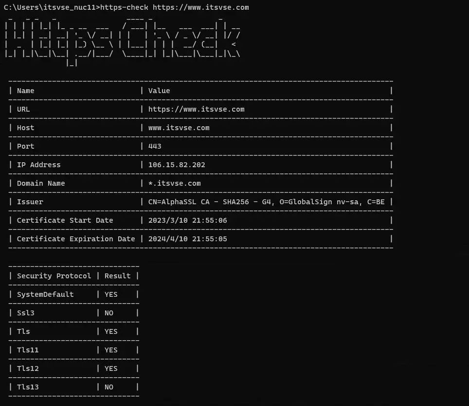 Https Check 工具 使用 .NET 开发了一个 Https 安全协议支持检测工具,其实就是将控制台应用发布到了 nuget 仓库,支持:netcoreapp3.1、net5.0、net6.0、net7.0。 GitHub 地址:https://github.com/itsvse/https-check nuget 地址:https://www.nuget.org/packages/https-check 安装命令如下: