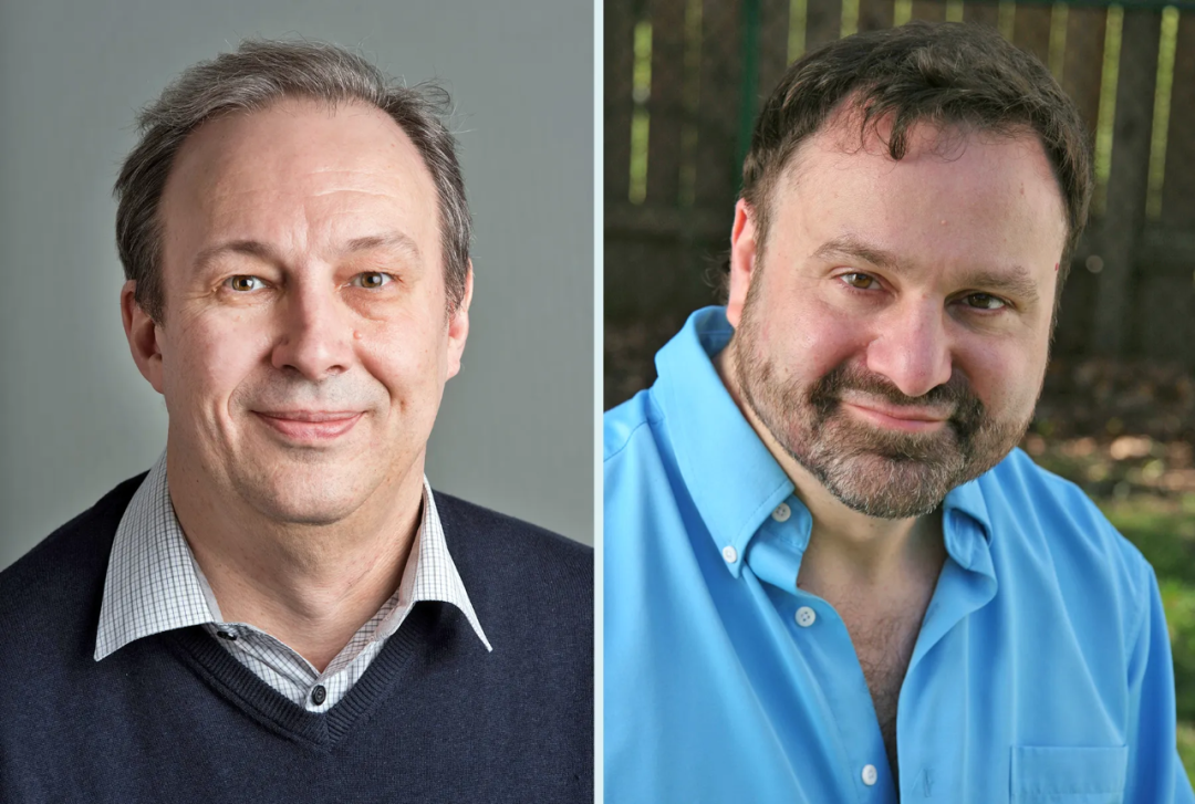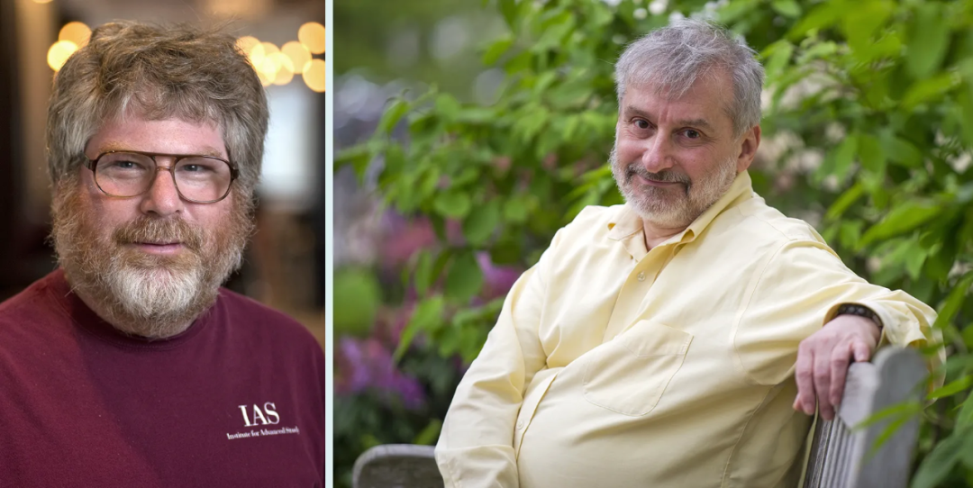 身穿蓝色毛衣的 Alexander Razborov 和身穿蓝色衬衫的 Steven Rudich。Alexander Razborov(左)和 Steven Rudich 在 1994 年发现了自然证明的障碍,这能解释为什么之前对 P ≠ NP 的证明尝试都失败了。
