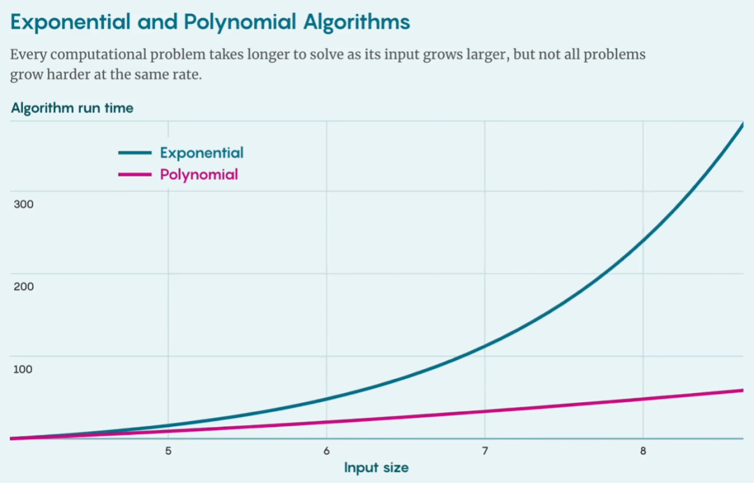 运行这个检验解的算法所需的时间与图的大小成正比。这类算法属于一个更宽泛的算法类别:多项式算法;其运行时间的增长是图大小的多项式函数。相比于指数级增长,多项式增长的速度较为平缓,因此即使是很大的图,多项式算法也依然可行。Carmosino 说:「它的效率要高得多。」
