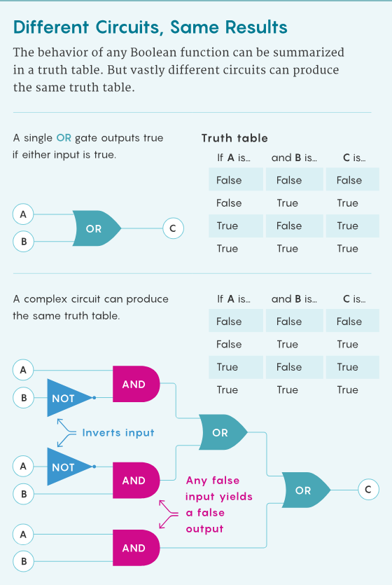 这个电路复杂性框架需要重新思考图灵的计算模型中最基础的概念。在这里,研究者考虑的不是计算问题和解决问题的算法,而是布尔函数和计算这些函数的电路。布尔函数以布尔变量(真或假,1 或 0)为输入,输出的也是真或假、1 或 0。与算法类似,电路描述的也是在任意输入下得到输出的过程。