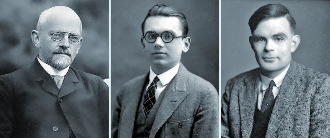 大卫・希尔伯特、库尔特・哥德尔和阿兰・图灵身着正装的黑白照片。1920 年代,大卫・希尔伯特(左)希望让数学有更加坚实的基础。库尔特・哥德尔和阿兰・图灵后来证明希尔伯特的梦想无法实现。