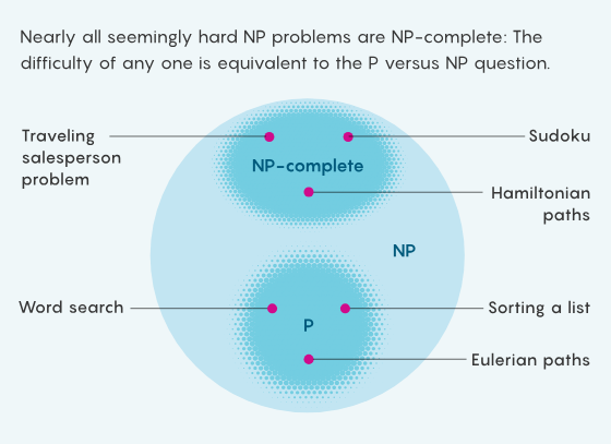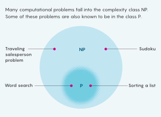 在数量不断变多的几百个复杂性类中,「P」和「NP」是其中最著名的两个。粗略地说,P 是一类很容易求解的问题,比如按字母顺序排列一个列表。NP 这一类则是有容易检验的解的问题,比如数独解密。由于所有容易求解的问题都容易检验,所以 P 中的问题也都属于 NP。但某些 NP 问题似乎难以解决 —— 你无法直接靠直觉就填满一个数独,而是需要先尝试许多可能性。有没有可能这种表面上的困难只是一种假象 —— 其实存在某种简单的技巧可以求解每个易于检验的问题?