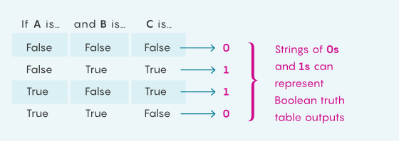 要理解这种关联,可以这样想象:在有许多输入变量的布尔函数的真值表的输出列中,使用 1 替换每一个「真」,使用 0 替换每一个「假」。