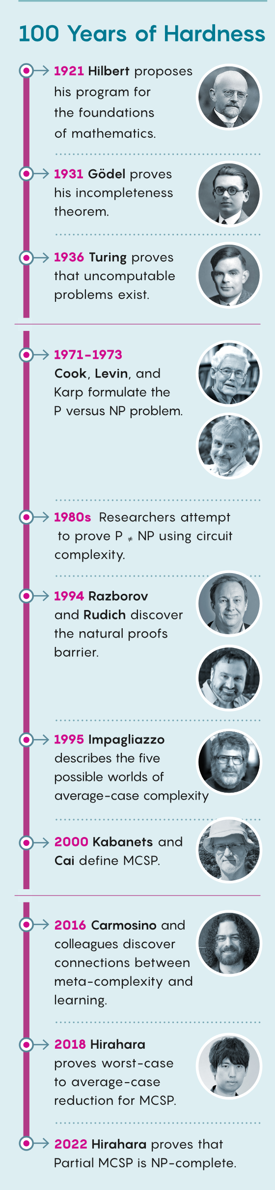 Kabanets 知道他和蔡进一并非最早思考被他们命名为 MCSP 的问题。苏联的数学家早在 1950 年代就研究过一个非常相似的问题,那时候他们是想尝试理解不同计算问题的固有难度。莱昂尼德・列文在 1960 年代末发展后来的 NP - 完备性理论时也曾与这个问题搏斗过,但他没能证明它是 NP 完备的,而且他发表的开创性论文中也没有它。