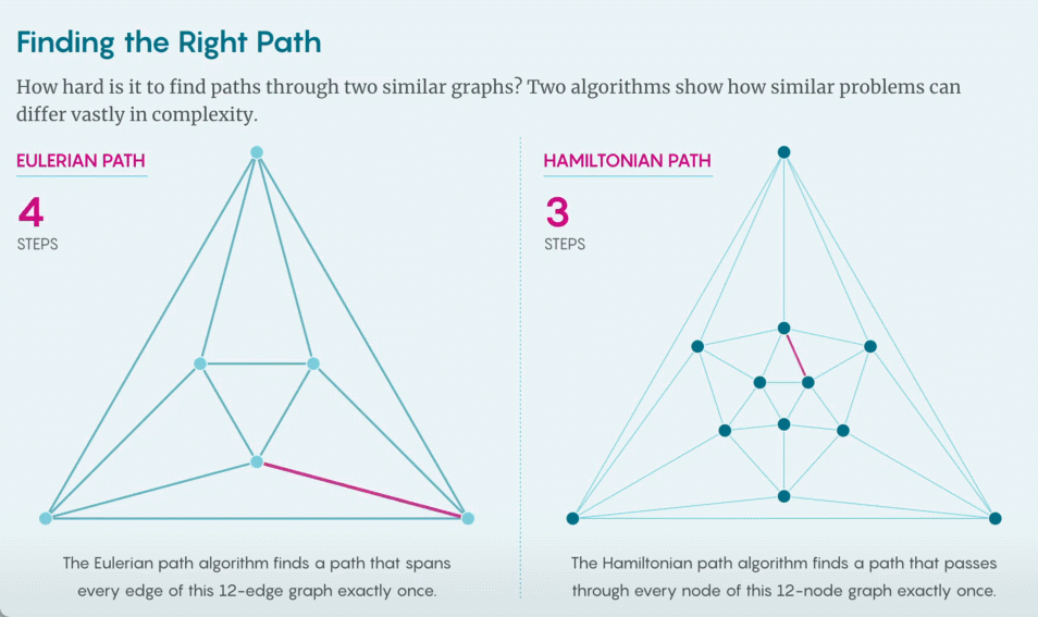 哈密顿路径问题具有明显的不对称性:你可以使用一个快速的多项式算法检验一个解是否正确,但却需要指数级算法才能找到一个解。这种不对称性可能并不出人意料,毕竟欣赏一件艺术杰作比创作一件艺术杰作更容易,检验一个数学证明也比证明一个新定理更容易,然而并非所有计算问题都具有这样的不对称性质。事实上,就存在一个与寻找哈密顿路径问题非常相似但行为表现大相径庭的问题。