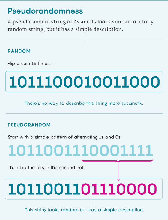 如果这个布尔函数的电路复杂性很高,那么这个很长的输出列表原则上就无法与真正随机的 0 和 1 构成的字符串区分开 —— 比如通过不断掷硬币得到的字符串。但如果该函数的电路复杂性较低,这个字符串必定有一个简单的简明描述,即便其可能看起来很复杂。这使其非常类似密码学使用的伪随机字符串,其简明描述便是那表面的随机性之下隐藏的秘密消息。