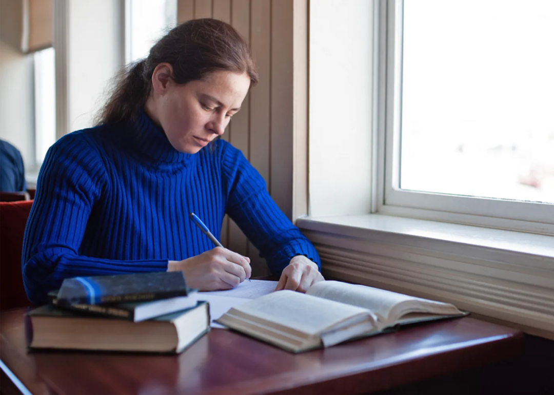 Antonina Kolokolova 身穿一件蓝色毛衣坐在一张桌子前。2016 年,Antonina Kolokolova 与 Carmosino、Impagliazzo 和 Kabanets 共同证明 MCSP 与学习之间存在惊人的联系,这让人们再次关注起元复杂性。