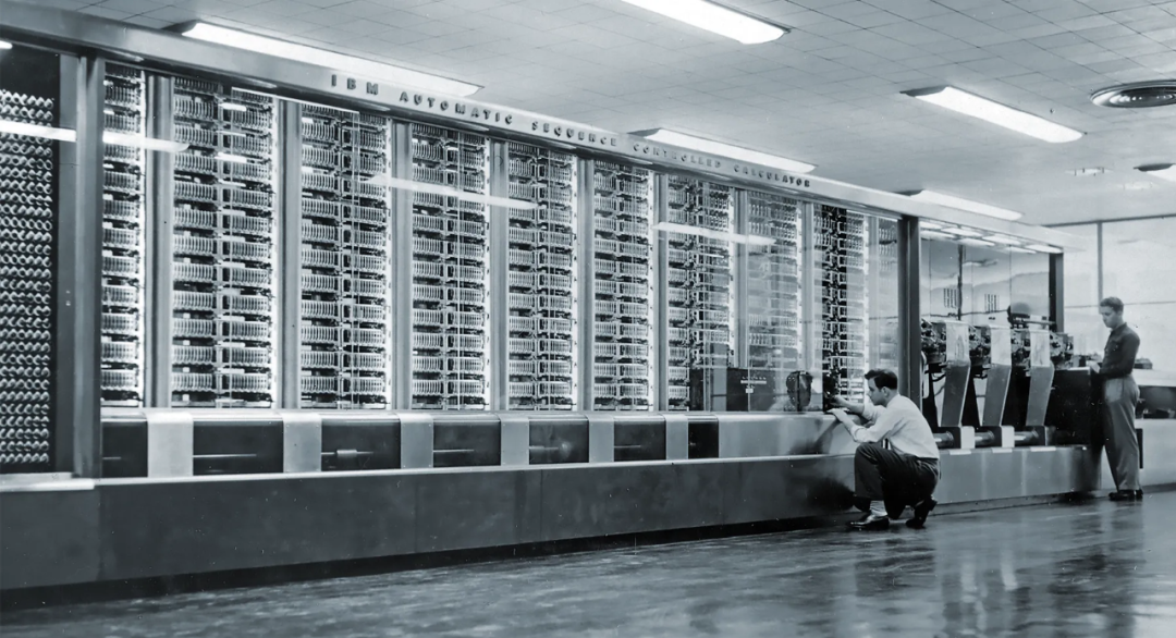房屋大小的 Harvard Mark I(哈佛一型)计算机的黑白照片。这张照片摄于 1944 年,这台 Harvard Mark I 计算机的构建模块是机电开关,正如香农在其论文中分析的那样。