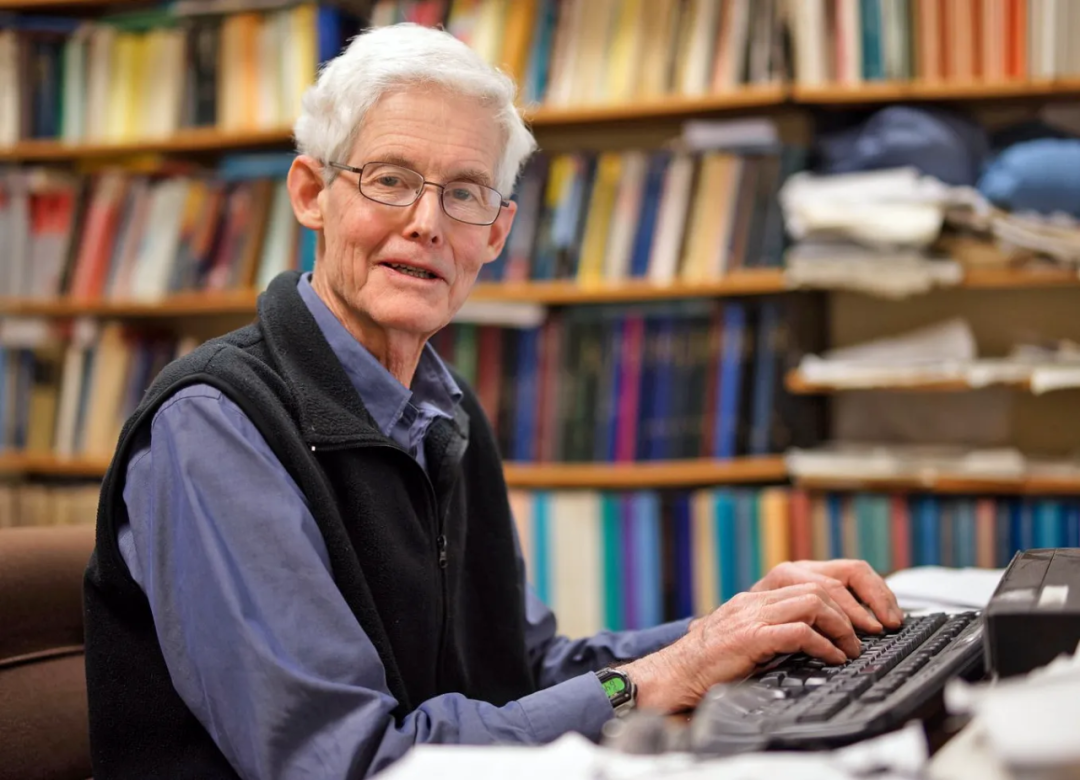 身着羊毛背心的史蒂芬・库克坐在一张桌子前。史蒂芬・库克与莱昂尼德・列文和理查德・卡普一起在 1970 年代形式地描述了 P 与 NP 问题。
