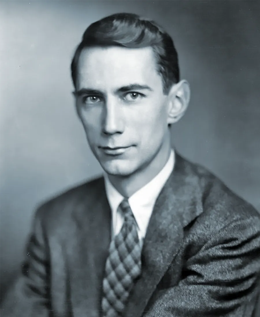 克劳德・香农身穿西装的黑白照片。克劳德・香农在自己的硕士论文中发展出了一套基于电路的计算理论模型。