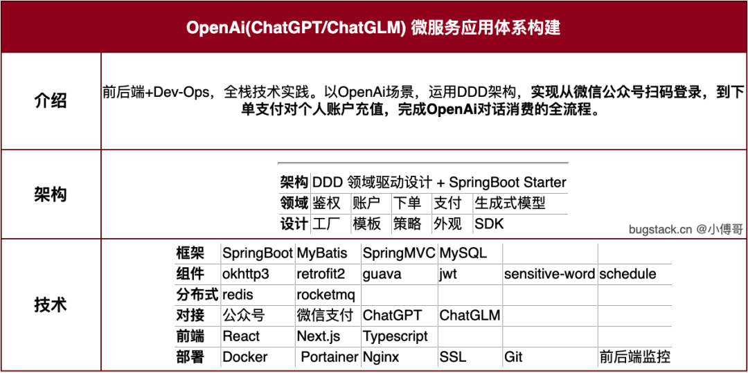 本次项目,是一个具有前后端 + Dev-Ops的综合项目实践,也是最新 DDD 架构模型的落地开发,在这个项目中你会学习到非常干货的技术运用、场景方案,也会学习到系统的部署、运维、监控等知识内容。
