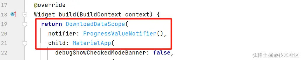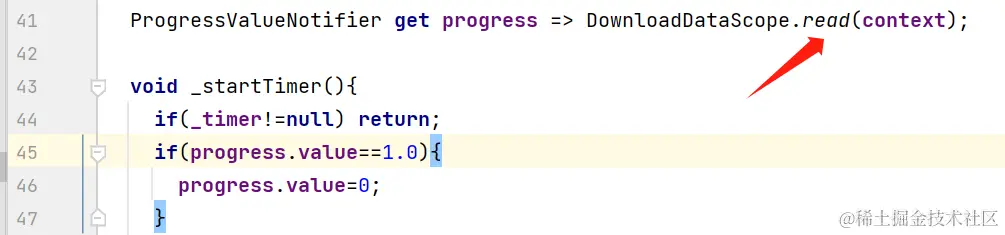 如下所示,定义 DownloadDataScope 类型,在构造中传入可监听对象和子组件,然后定义两个静态方法 of 和 read 获取存储的数据。获取的方式是通过上下文向上查询特定类型的组件。