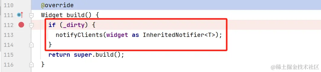 也就是说,这里当可监听对象发生变化时,会通知 InheritedNotifier 对应的元素进行重新构建,触发 build 方法。如果 _dirty 为 true ,会触发 notifyClients 方法,通知依赖者: