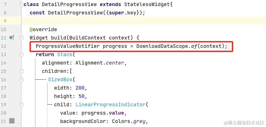 使用时就非常方便,通过静态方法 of 根据上下文获取可监听对象即可。此时称: DetailProgressView 依赖了该可监听的通知器,那么在可监听对象发出通知时,就会自动通知该组件,触发 build 方法。