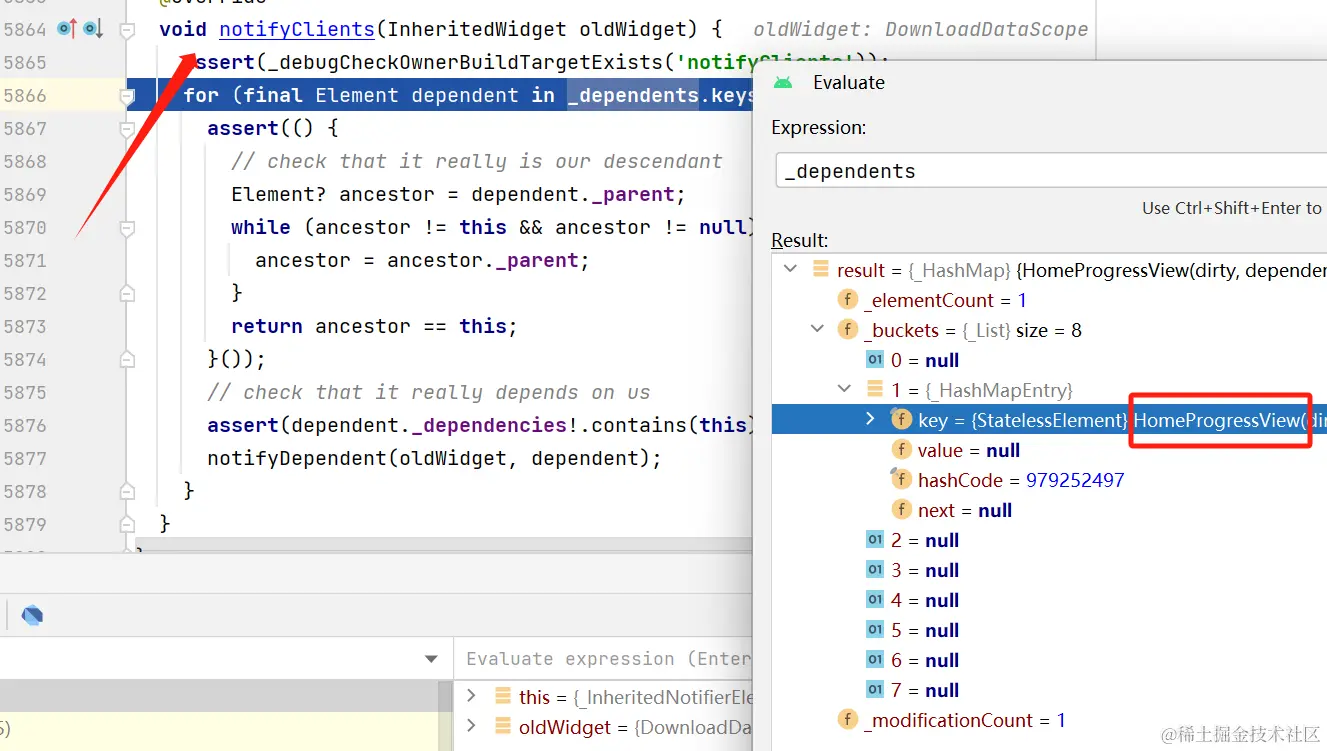 触发 notifyClients 时,将会通知元素映射中的元素触发 didChangeDependencies 。如下所示,此时其中是 HomeProgressView 对应的元素: