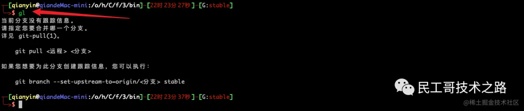 重新打开 Fish Shell 尝试使用别名 gl 来拉取代码, 如下图发现可以正常使用别名则说明我们配置是生效的。