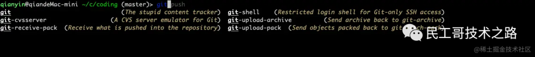 这里是输入 git 以及空格后按下 Tab 的结果, 它将给出 git 的所有可能命令以及描述。