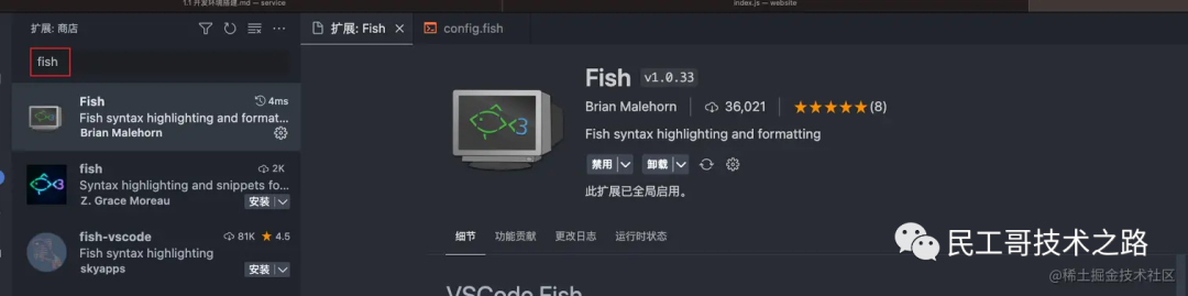 默认情况下, vscode 是不支持 fish 语法高亮的, 这里我们可以安装一个 fish 插件, 这样就可以支持语法高亮、格式化了。