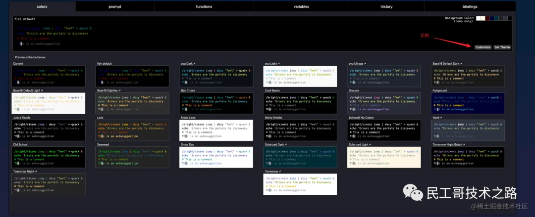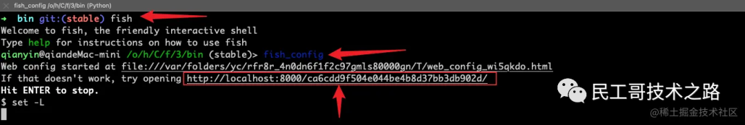 首先我们需要通过 fish 进入 Fish Shell, 然后再执行 fish_config 命令, 这时将自动打开一个配置页面。