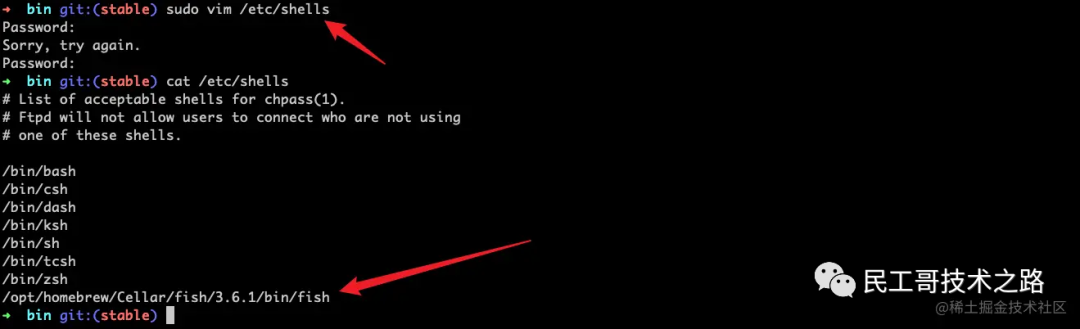 下面我们需要在 /etc/shells 中追加 fish 的 脚本 路径, 否则在切换默认 Shell 时会报 non-standard shell 错误, 脚本路径为: {fish 安装路径}/bin/fish。