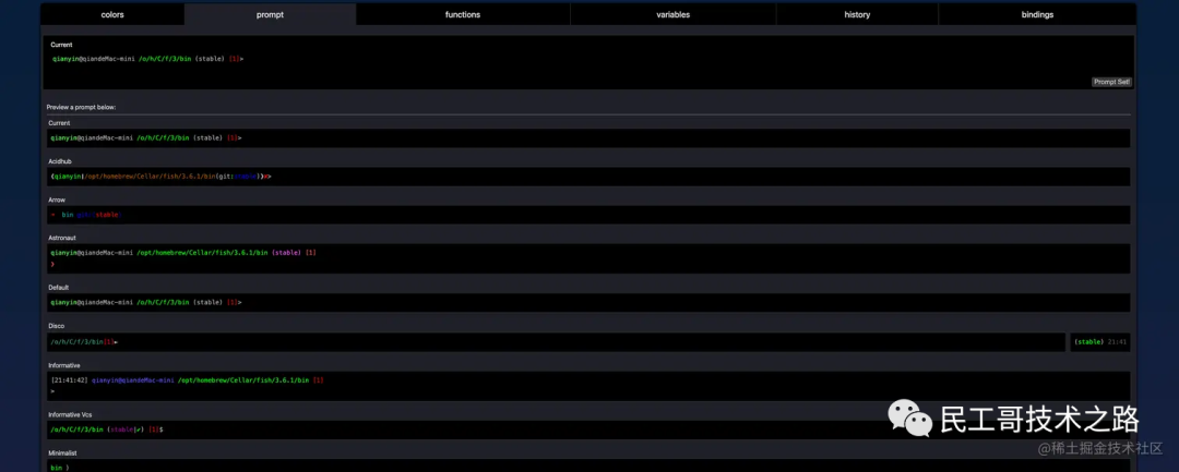 第二部分则是设置命令行前面的提示符, 同样的官方默认给了很多种选择, 特别的是配置页面没有提供自定义 提示符 的一个入口, 如果需要自定义则需要自己修改配置文件, 编写函数。