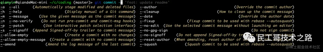当然除了补全命令, 它还可以补全参数, 如下是输入 - 后按下 Tab 的结果, 它将给出 git commit 的所有可能参数以及描述。