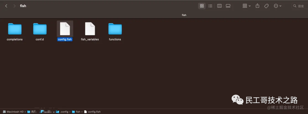 Fish Shell 为用户提供了一个独立的配置文件(~/.config/fish/config.fish), 我们可以在这个文件里面写入各种自定义函数、别名、常量..., 在每次启动 Fish Shell 后, 该文件将被自动加载进来, 这里我们可以通过 cat 来查看该配置文件。