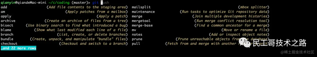 如下是输入完 git 直接按 Tab 的结果, 它直接列出了所有可能命令以及描述。