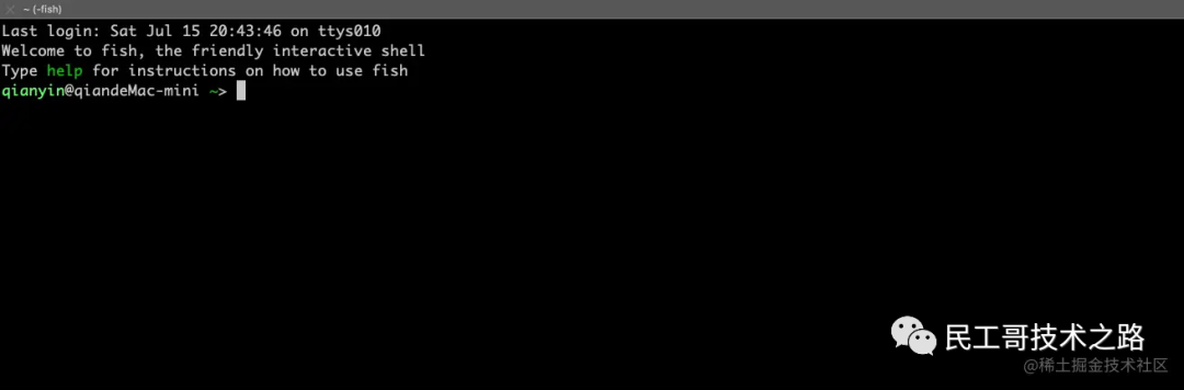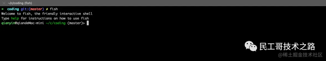 默认情况下命令行终端使用的 Shell 是 Bash 或者 zsh, 这里我们需要通过 fish 命令切换到 Fish Shell。