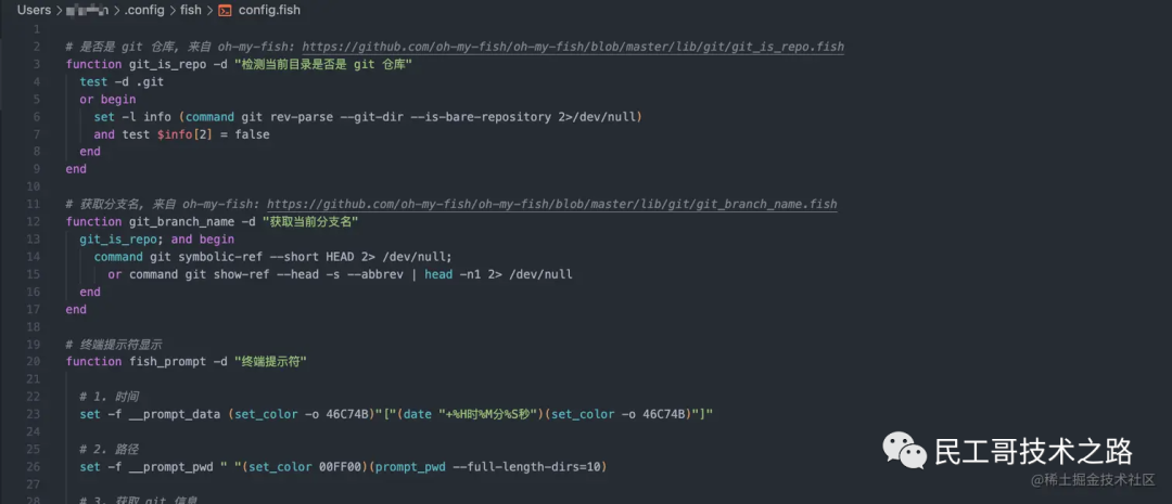 方法: 在配置文件 ~/.config/fish/config.fish 中, 新增一个 fish_prompt 函数用于定义 提示符。