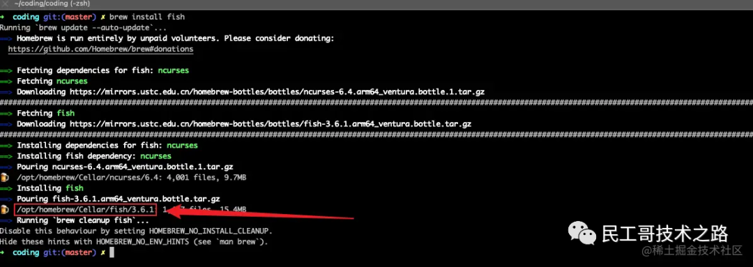 在开始之前我们需要先确认下 fish 的安装路径, 在安装 fish 时输出日志中会给出对应的安装地址。