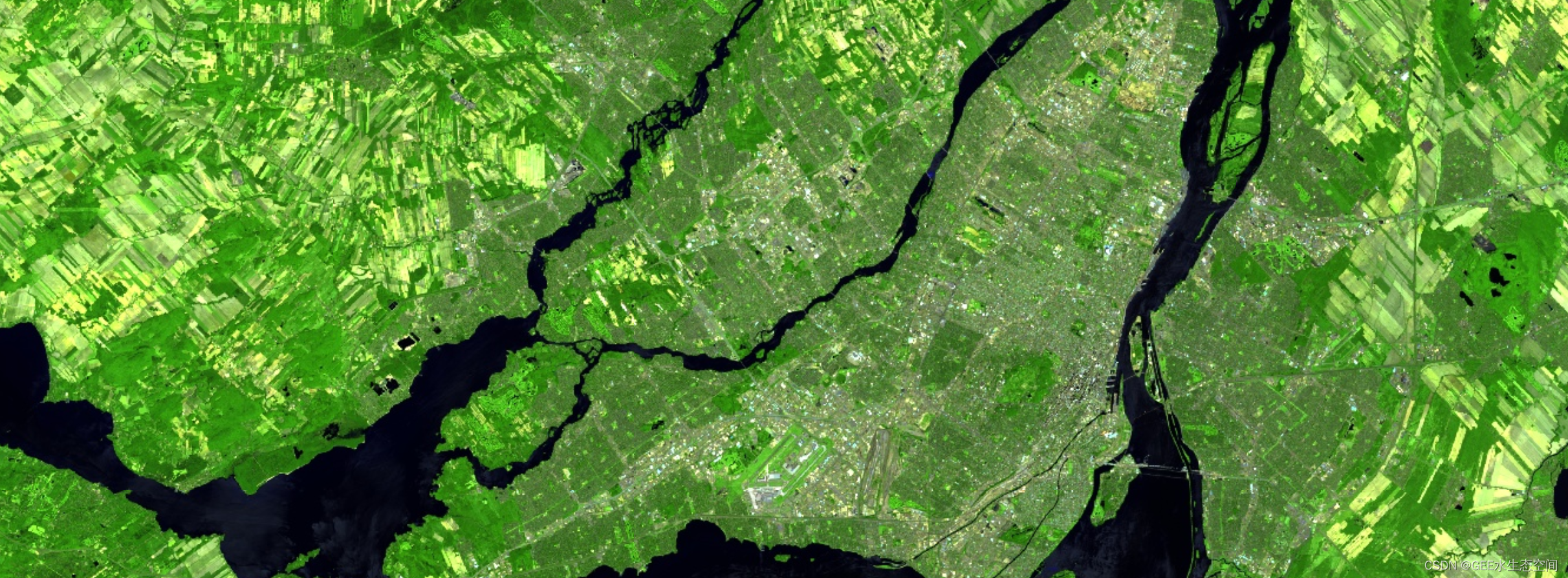 我们使用两个不同(但相关)的假彩色图像对加拿大蒙特利尔的最终描绘,突出了农业和城市地区以及水道之间的差异。