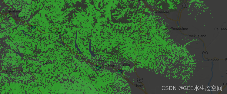 我们还可以使用调色板来突出显示分类数据。如果我们想在研究区域创建森林/非森林掩膜,我们可以使用国家土地覆盖数据集NLCD以深绿色突出显示所有森林类别。NLCD 中有许多土地覆盖类别,但为了简化此示例,我们仅在东部瀑布的同一区域使用“落叶林”、“常绿林”和“混交林”。再次启动一个新脚本并粘贴下面的代码。您应该会看到类似于下图的结果图像。