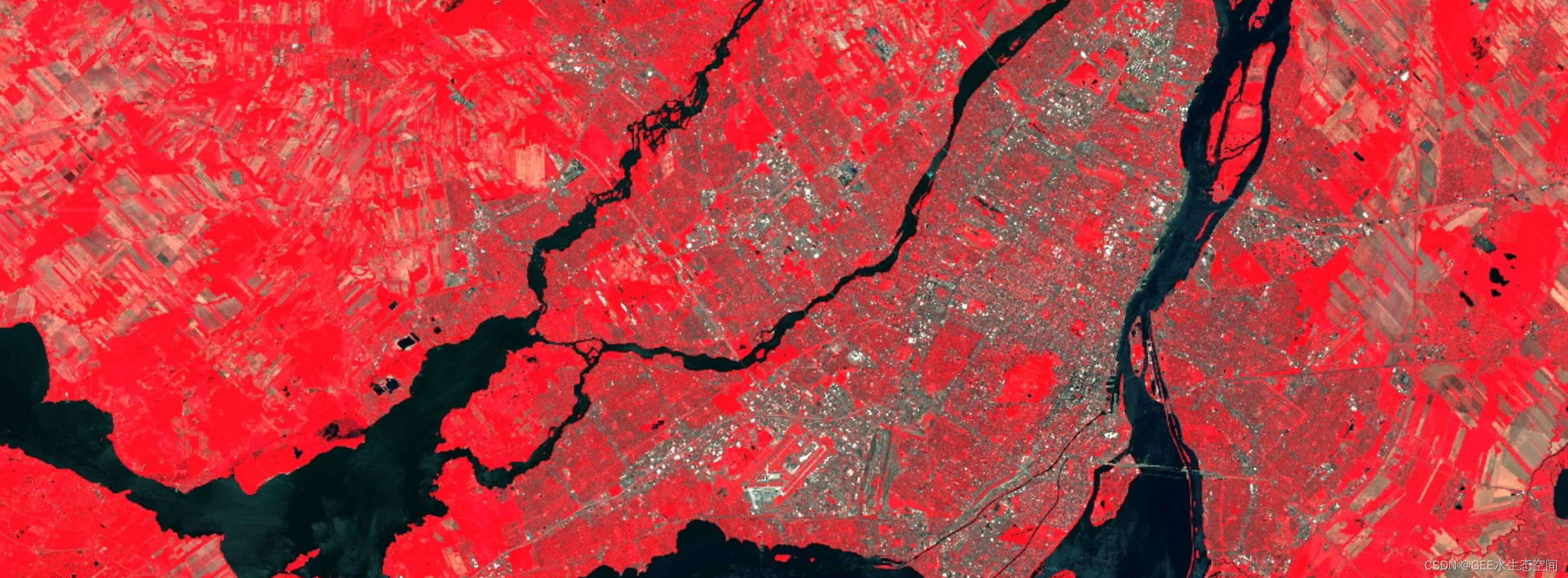用彩色红外图像替换我们的真彩色图像,以识别加拿大蒙特利尔和周边陆地区域的活跃植被和水道区域。