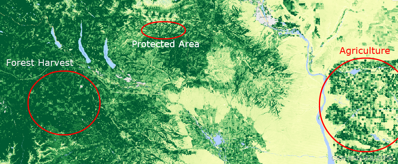 通过使用这个特定的调色板,我们可以开始挑选土地管理活动。强烈的几何和/或线性特征可以指示森林采伐和农业等活动,而不规则形状通常可以是保护区(即国家森林或荒野地区)。