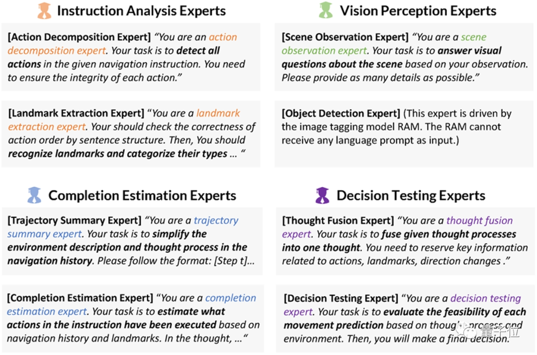 作者首先以提示方式赋予LLM(大语言模型)和MLM(多模态大模型)专家角色和特定任务,激活它们的领域知识和能力,由此构建具备不同特长的视觉导航专家团队。