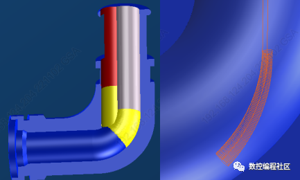 弯管内R相接位置采用普通程序编制方法无法加工,本次攻关准备采用GIBBS CAM软件三轴铣削功能编制曲面加工程序,利用后置处理软件生成G代码程序导入机床进行切削加工。通过模拟实验,已经确定正常的退刀法无法加工尺寸过小的弯式外壳,根据零件形状的实际情况再结合编程软件的应用,摸索出了一种新的特殊的退刀方法,即沿零件弯管处走3D弯曲线抬刀。改良后的刀具路径按加工完成反向R后沿着零件的弯管形状走3D弯曲线到内圆圆心处再抬刀的,这样的走刀方法避免了伤到零件内壁的任何地方,完美避开了所有容易碰壁的危险点,保全了零件的完整性和形状要求。